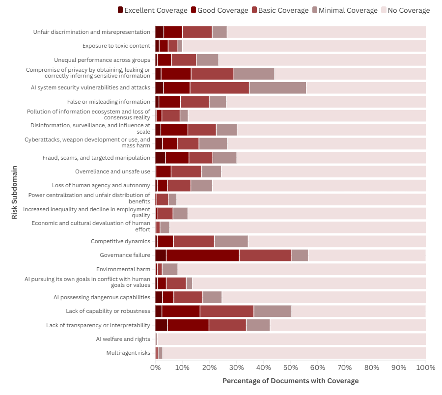 The most covered risk subdomains were Governance failure, AI system security vulnerabilities & attacks and Lack of transparency or interpretability.