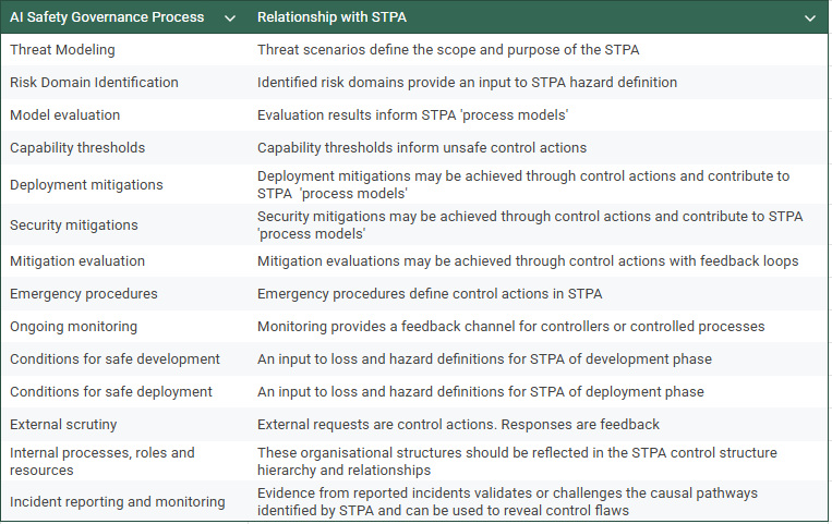 In the discussion above, we identify a number of ways that STPA could interact with existing AI governance mechanisms including safety cases and processes that are described in the safety frameworks of AI developers. It would be of value to explore each of these potential interactions in depth with worked examples. The output of this work could be a set of interface control documents or process flow diagrams accompanied by an analysis of the benefits (if any) that STPA adds to existing processes.