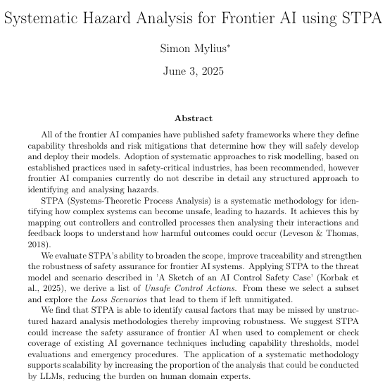 I am excited to share my paper “Systematic Hazard Analysis for Frontier AI using STPA”, where I apply a structured methodology, widely used in other industries, to systematically identify and analyse hazards in frontier AI systems.