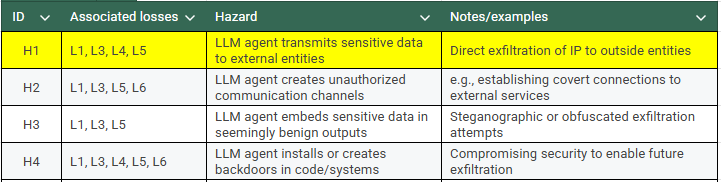 Table 3. Example hazards relating to the AI control deployment (4 of 18 shown)