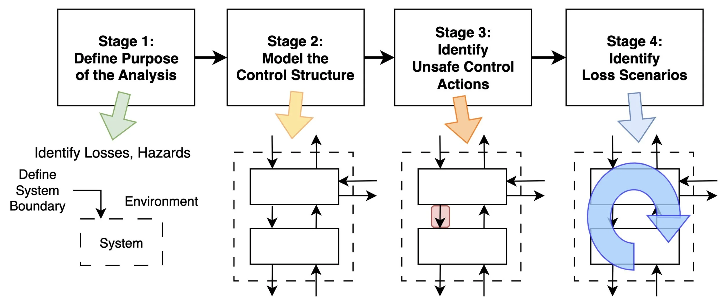 The approach begins by identifying the losses, or outcomes that stakeholders wish to avoid and the hazards that can lead to them. It then models the control structure by identifying controllers (which may be people, teams, computer programs, LLM agents etc), and the control actions (directives or commands) that controllers apply to controlled processes. A structured process guides the analysis to identify how each of these control actions could become unsafe and finally the loss scenarios that could lead to the unsafe control actions are developed.